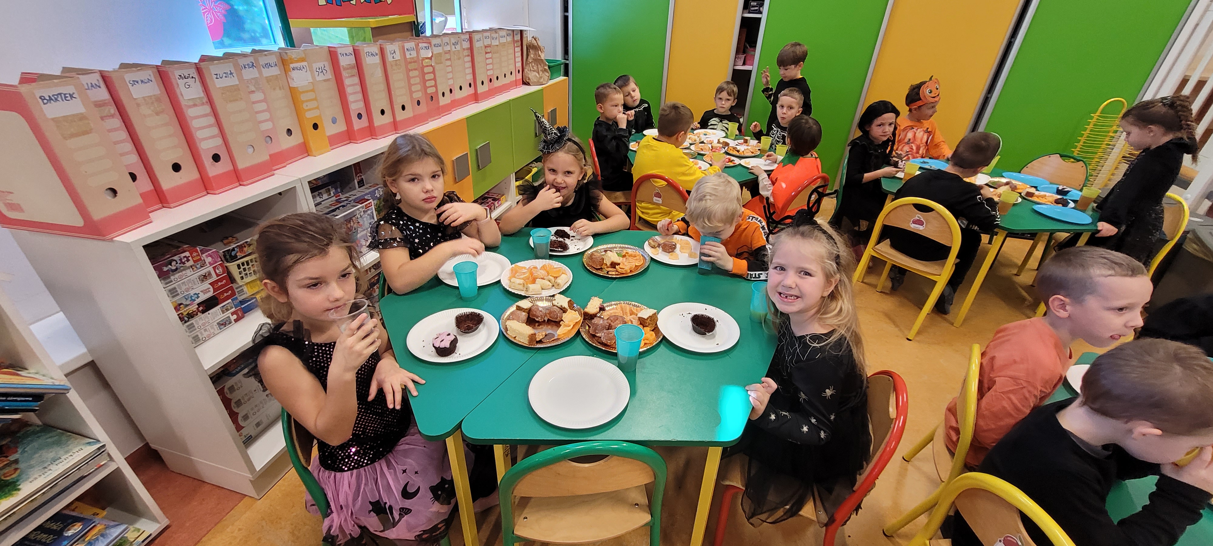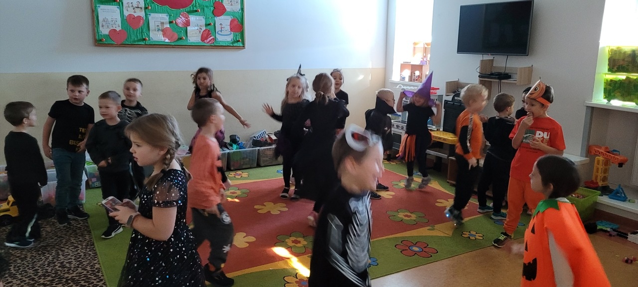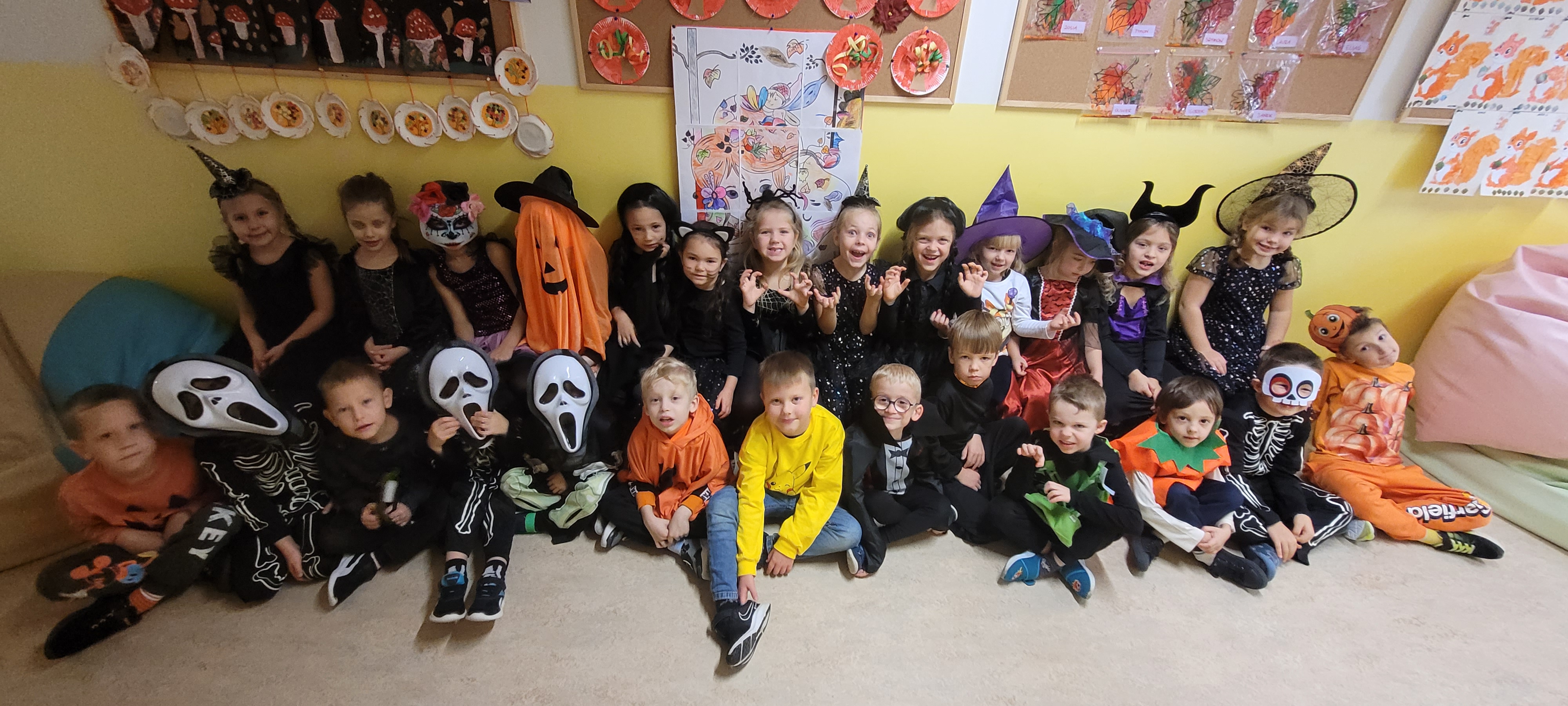 31 października małe Jabłuszka i Niedźwiadki miały imprezkę. Każda okazja jest dobra aby się przebrać i potańczyć, a nasze Ciocie w porozumieniu z rodzicami zorganizowały nam jeszcze do tego wszystkiego słodki poczęstunek. W dziki wir zabawy rzuciły się wszystkie Czarownice, Dynie, Czarne Koty oraz Duszki. Bawiliśmy się straaaasnie fajnie, bo w końcu był to bal w konwencji Halloween. Mamy nadzieję, że za rok także uda nam się zorganizować taką zabawę. Sala Niedźwiadków na dwie godzinki zamieniła się w stary, pokryty pajęczynami loch co zrobiło na nas bardzo duże wrażenie. Cukierek albo psikus!