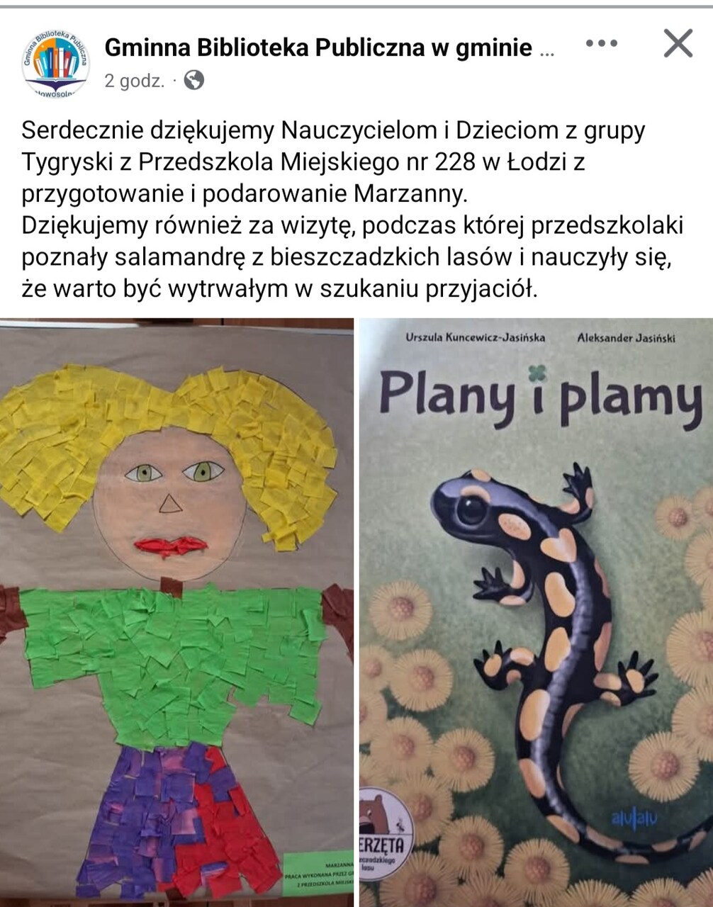 19 marca dzieci z grupy "Tygryski " odwiedziły Gminną Bibliotekę Publiczną. Przedszkolaki z wielką radością zapoznały się z magicznym dla nich miejscem. Była to pierwsza wizyta naszej grupy wśród tylu książek. Z biblioteką zapoznała "Tygryski" pani Kasia - opowiadała dzieciom o tym miejscu a przedszkolaki z zainteresowaniem oglądały książki znajdujące się na półkach, ale szczególnie zainteresował ich dział dla najmłodszych. Dzieci dowiedziały się, co należy zrobić, aby stać się czytelnikiem biblioteki oraz jak należy sie w niej zachowywać. W trakcie pobytu "Tygryski" poznały salamandrę z bieszczadzkich lasów i nauczyły się, że warto być wytrwałym w szukaniu przyjaciół. Na koniec dzieci podarowały paniom bibliotekarkom samodzielnie przygotowaną i ozdobioną Marzannę. Do zobaczenia za miesiąc.